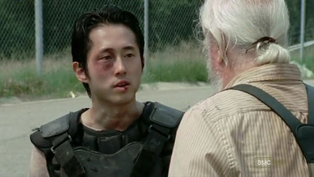 Glenn starts to walk away, then turns back. His new orientation places his right shoulder and Hershel's left in rough alignment: