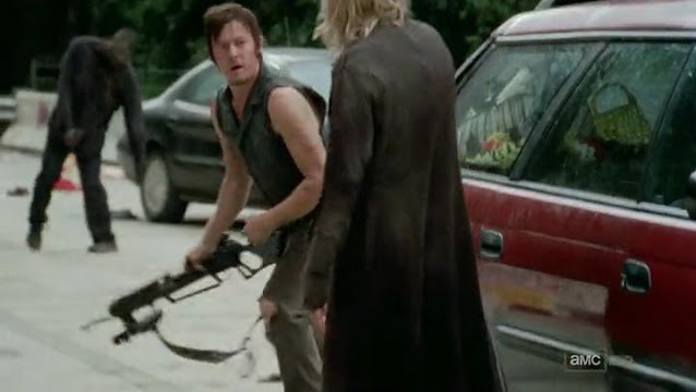 At one point in "Home," Daryl comes to the assistance of some folks being assailed by zombies on a bridge. He slams the head of one of the creatures in the rear hatch of a vehicle, pulping it and covering his own hands (particularly the right one) in gore: